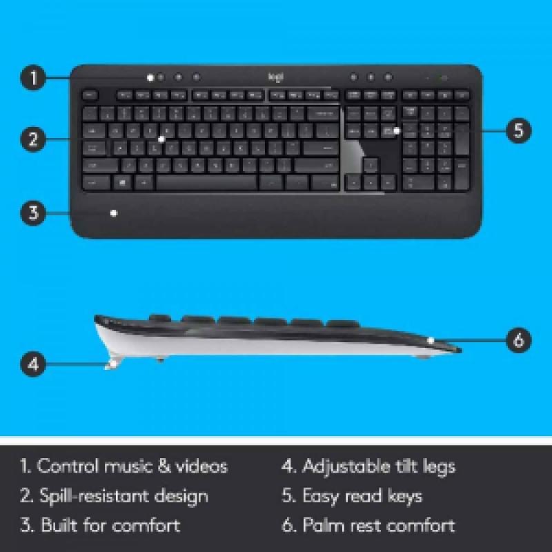 کمبو( Logitech MK540 )کیبورد و ماوسی با دوام است که برای راحتی، دقت و عمر باتری بالا طراحی شده است. کیبورد این کومبو یک کیبورد کامل است که دارای دکمههای میانبر برای کنترل بیشتر است و ماوس این کومبو دارای طراحی (Ambidextrous )است تا به راحتی در دست شما قرار بگیرد. کلیدهای کیبورد به گونهای طراحی و بهینه سازی شدهاند که دقت عملکرد را ارتقا بدهد و صدای تایپ کردن کاهش پیدا کند. انگشتهای دست شما خیلی زود به این کیبورد عادت میکند و روی صفحه کلید و چیدمان فوری احساس خانه میکنند. استراحتگاه تعبیه شده برای کف دست و پایههای قابل تنظیم باعث میشوند تا به راحتی برای مدت طولانی پشت میز بنشینید.